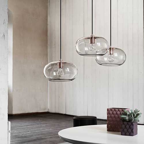 The Frandsen Kobe pendant lamp has a diameter of 30 centimeters and a cord length of 250 centimeters. The lamp is made of glass and is available in the colors opal white and smoked with copper fitting. The white lamp comes with a white ceiling cap and white cord, the transparent cap with a copper ceiling cap and black cord. The Frandsen Kobe pendant lamp has an E27 fitting.